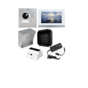 Dahua dvožični IP video interfonski komplet, inox vanjska jedinica DH-VTO2000A, touchscren monitor DH-VTH1550CHW, kutija za nazidnu ugradnju DH-VTOB108 s napajanjem 24Vdc i kontrolerom VTNC3000A.
